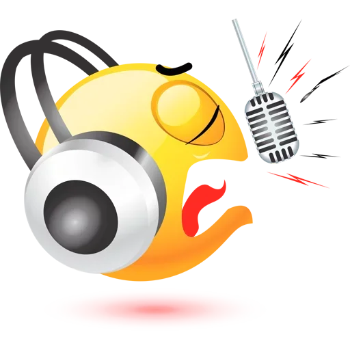 Um emoji amarelo usando fones de ouvido e cantando em um microfone, com uma expressão de felicidade e linhas de efeito ao redor do microfone.