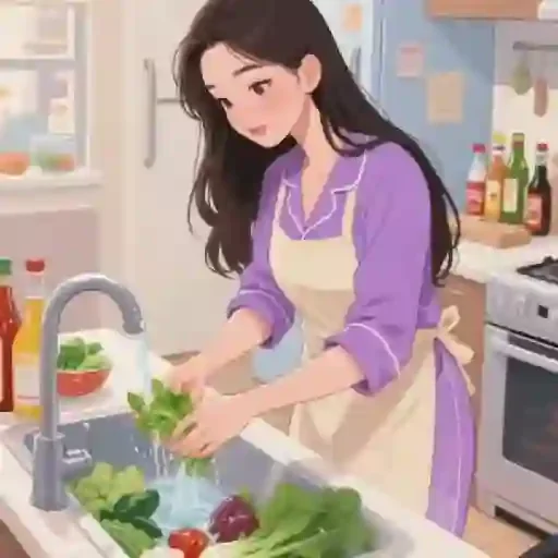 Uma mulher lava folhas em uma pia de cozinha. Ela está usando um avental bege sobre uma camisa roxa e tem cabelo preto longo.