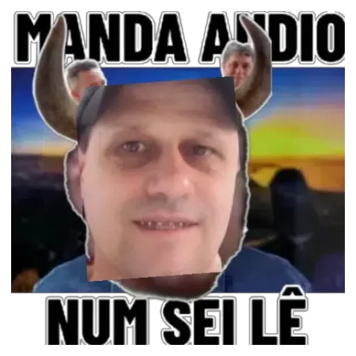 Um homem com chifres de touro na cabeça, vestindo uma camisa azul, com um pôr do sol ao fundo. A imagem traz o texto 'MANDA ÁUDIO NUM SEI LÊ'.