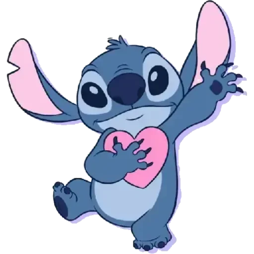 Stitch, personagem de Lilo & Stitch, com orelhas grandes rosa, olhos grandes e um coração rosa nas mãos.