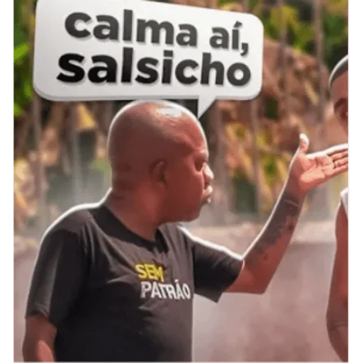 Um homem careca de braço tatuado, com uma expressão séria, diz 'calma aí, salsicho' em um speech bubble. Ele veste uma camiseta preta com 'SEN PATRIÁ'.