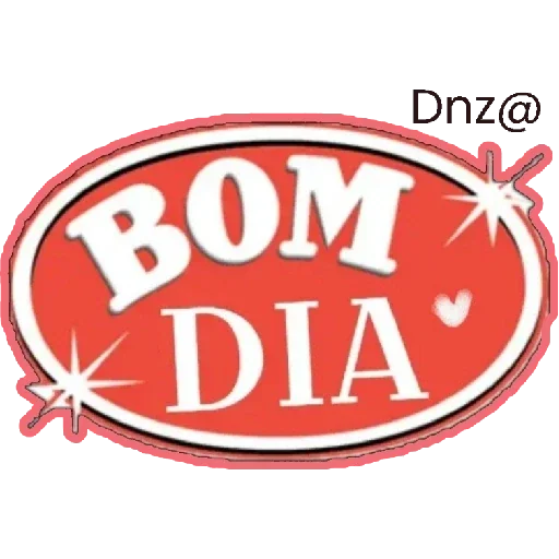 Um oval vermelho com 'BOM DIA' em letras brancas, decorado com estrelas e um coração.