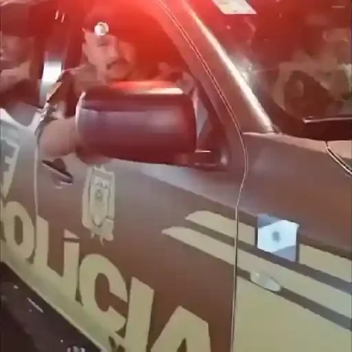 Um policial dentro de uma viatura da polícia com luzes vermelhas acesas, fazendo um gesto com a mão.