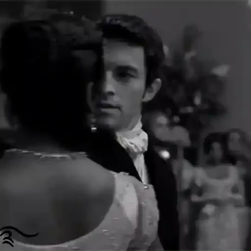 Cena de filme preto e branco com casal em destaque, homem de terno e mulher de vestido, ambos com expressões sutis.