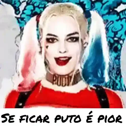 Harley Quinn com um sorriso malicioso, usando um colar com a palavra 'PUTIV' e uma camisa vermelha. Ao fundo, um padrão azul e preto. Abaixo dela, a frase 'SE FICAR PUTO É PIOR'.