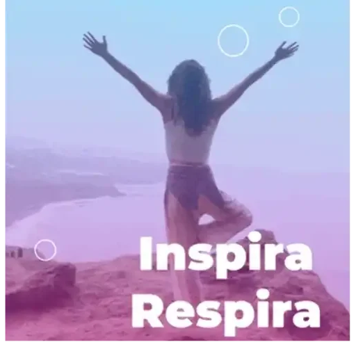 Mulher com os braços abertos e perna levantada em uma paisagem com vista para um vale, com o texto 'Inspira Respira' sobreposto.