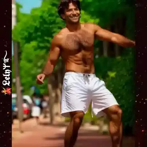 Homem sem camisa, com shorts brancos, sorrindo e fazendo um gesto com o braço em uma rua arborizada.