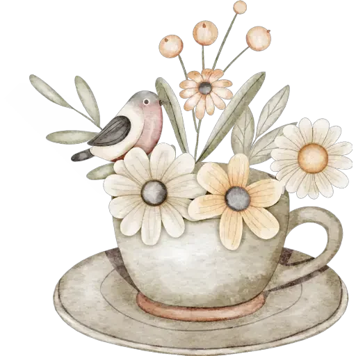 Xícara de chá com flores brancas e begôl e pássaro cinza e rosa em cima.