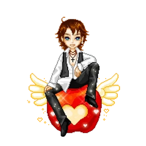 Um menino anime com cabelo castanho e olhos azuis sentado em um coração vermelho com asas amarelas.