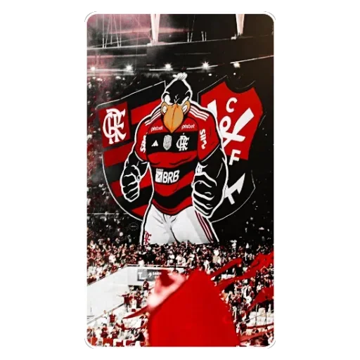 Um mascote de um time de futebol com uma camisa vermelha e preta, com uma bandeira atrás, em um estádio lotado.