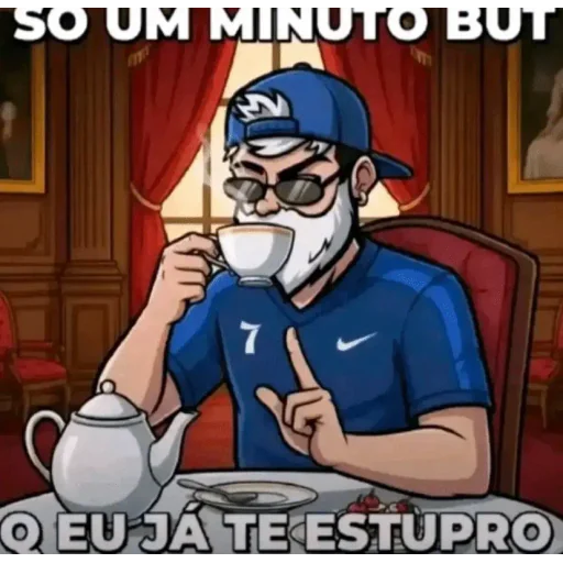 Um homem de meia-idade com barba branca e óculos senta-se à mesa, bebendo de uma xícara de chá. Ele veste uma camisa azul com o número 7 e um boné azul. A imagem contém o texto 'SÓ UM MINUTO BÚT O EU JÁ TE ESTUPRO'