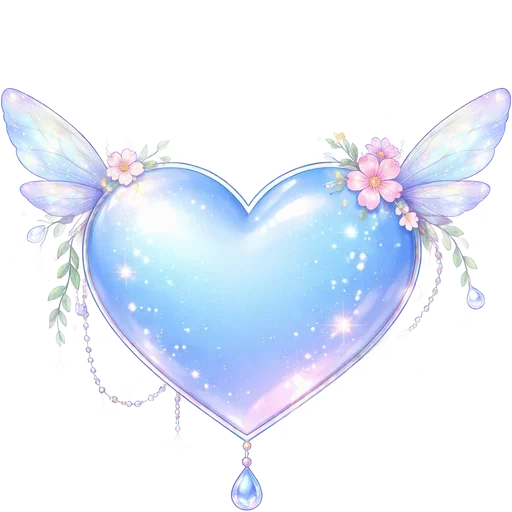 Coração azul brilhante com asas de borboleta e flores rosadas. O coração tem reflexos de luz e uma gota de água brilhante na parte inferior.