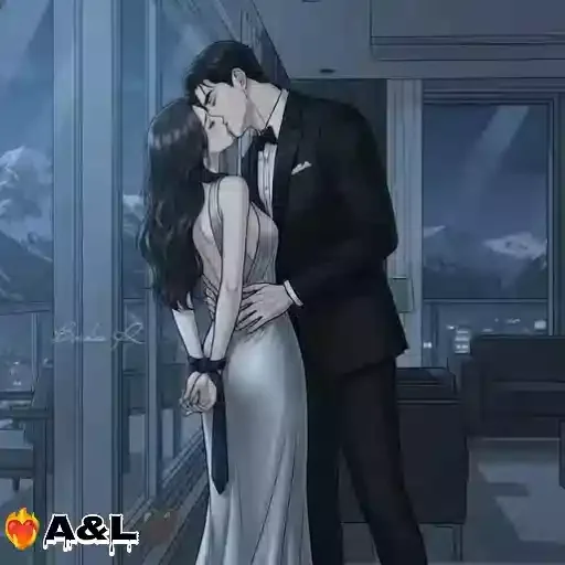 Um casal se beijando em um ambiente elegante. O homem está vestido com um terno preto e a mulher com um vestido branco.