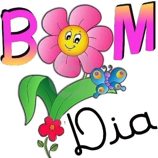 Uma flor rosa com um rosto feliz e uma borboleta azul ao lado, com as letras 'BOM Dia' coloridas.