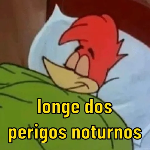 Pássaro cartoon deitado na cama com a cabeça na almofada, coberta verde, texto "longe dos perigos noturnos" em amarelo.