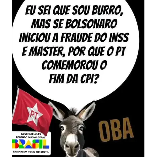 Um burro com uma bandeira do PT ao fundo e um discurso em uma bolha de fala. O texto na bolha de fala diz 'EU SEI QUE SOU BURRO, MAS SE BOLSONARO INICIOU A FRAUDE DO INSS E MASTER, POR QUE O PT COMEMOROU O FIM DA CPI?'