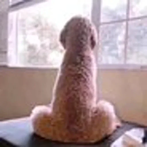 Um cachorro de pelo ondulado, cor de mel, sentado em uma mesa, olhando pela janela.
