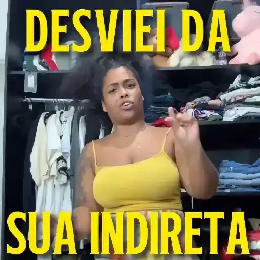 Uma mulher negra com cabelo preto e um top amarelo, fazendo um gesto com a mão, em frente a uma prateleira de roupas. A imagem traz o texto "DESVIEI DA SUA INDIRETA" em letras grandes e amarelas.