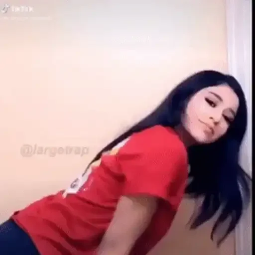 Uma jovem mulher de cabelo preto e camisa vermelha fazendo uma pose sensual, com um fundo de parede bege e marcação @largewing.