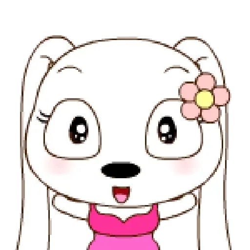 Um desenho de um animal branco com orelhas de coelho, vestindo um vestido rosa e com uma flor rosa no cabelo, parecendo surpreso ou feliz.