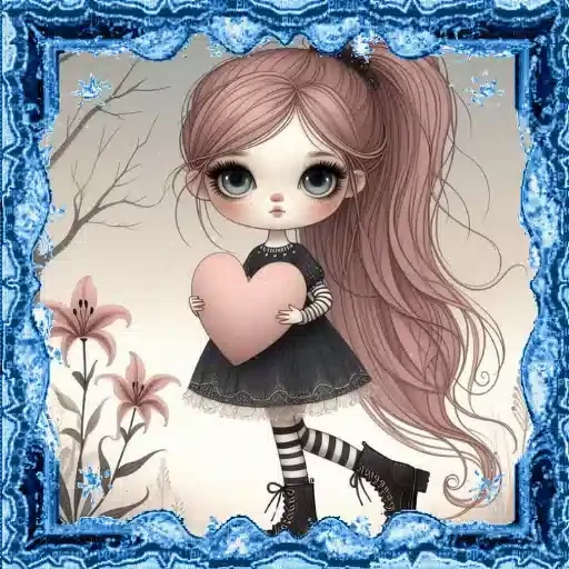 Uma menina de olhos grandes e cabelos rosa segurando um coração rosa, vestida de preto e branco, com flores ao lado.