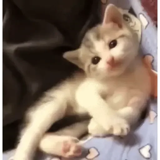 Gatinho fofo deitado em uma coberta com estampas de corações, com olhos pretos e focinho rosa.