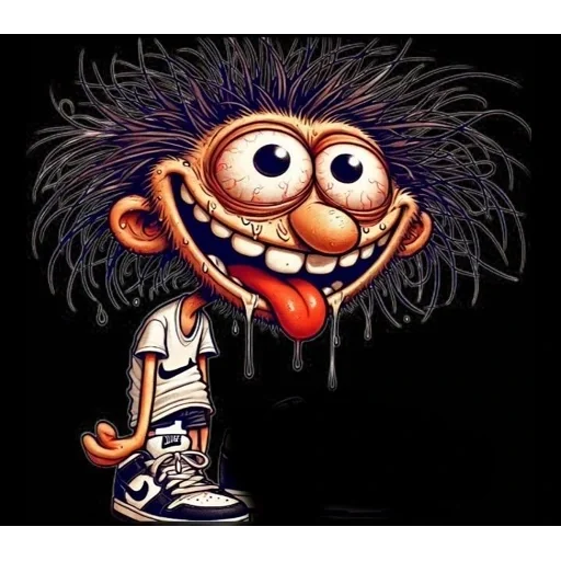 Personagem de desenho animado com cabelo desgrenhado, olhos grandes e língua para fora, parecendo sujo e desajeitado,…