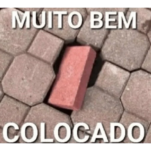 Um tijolo vermelho isolado em um piso de pedra com a frase 'MUITO BEM COLOCADO' em letras brancas.
