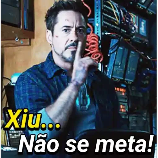 Homem com expressão séria, dedo indicador na frente da boca e um fio vermelho na mão, em frente a equipamentos eletrônicos. 'Xiu... Não se meta!'