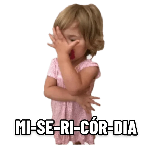 Menina de vestido rosa fazendo careta de dor ou constrangimento, com a mão no rosto e a legenda 'MI-SE-RI-CÓR-DIA'