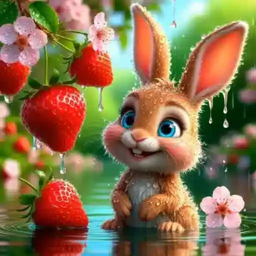Um coelho fofinho com olhos azuis brilhantes e orelhas grandes aparece em um ambiente com flores cor-de-rosa e morangos frescos. O coelho tem um sorriso leve e parece estar em um cenário natural com água.