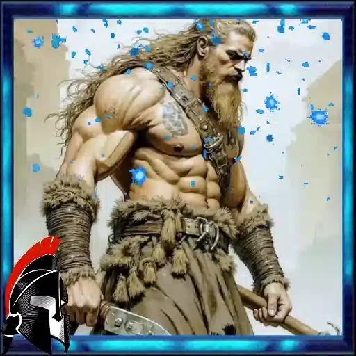 Um guerreiro musculoso com cabelos longos e barba, sem camisa, com pulseiras de pelagem marrom nos pulsos e um cinto com ferramentas. Ele está cercado por partículas azuis.