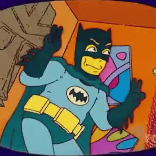Batman em uma cena de desenho animado, com um olhar surpreso e uma mão levantada, vestindo um traje azul e amarelo.