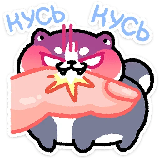 Um gato cartoon com rabo cinza e focinho branco, com uma mão tapando sua boca e a palavra 'кусб кусб' em azul acima.