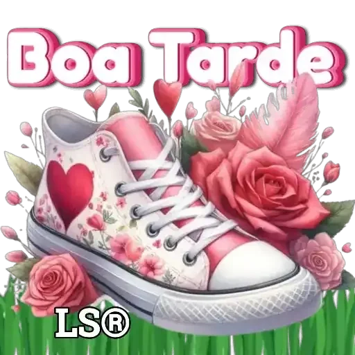 Um tênis branco com flores e um coração vermelho, rodeado de rosas e folhas, com a frase 'Boa Tarde' em letras grandes.