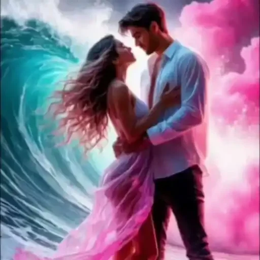 Casal se beijando em frente a uma onda gigante do mar, com nuvens cor-de-rosa ao fundo. O homem está vestido com uma camisa branca e calça preta, enquanto a mulher usa um vestido rosa.