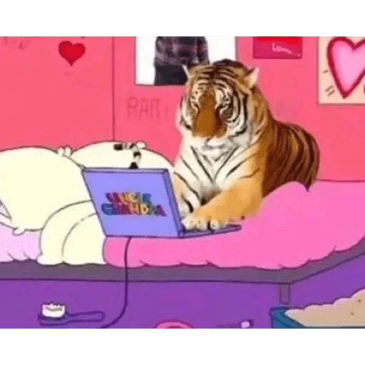Um tigre e um urso polar estão sentados na cama, com um laptop colorido entre eles. O tigre parece sério enquanto o urso está deitado.