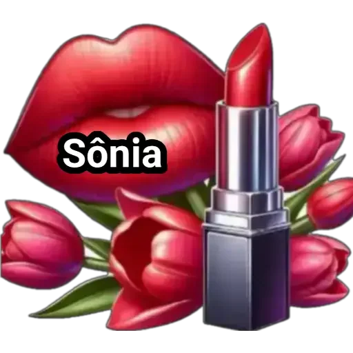 Um batom vermelho brilhante ao lado de um lábio pintado de vermelho e tulipas rosadas. O nome 'Sônia' aparece em destaque.