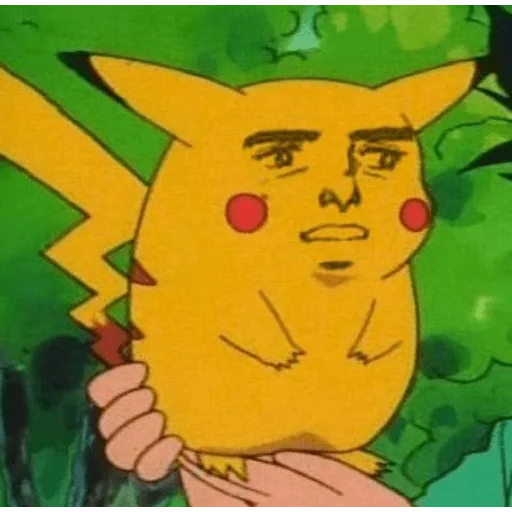 Pikachu com expressão facial séria e sobrancelhas franzidas, com uma mão segurando sua cauda. Fundo verde.