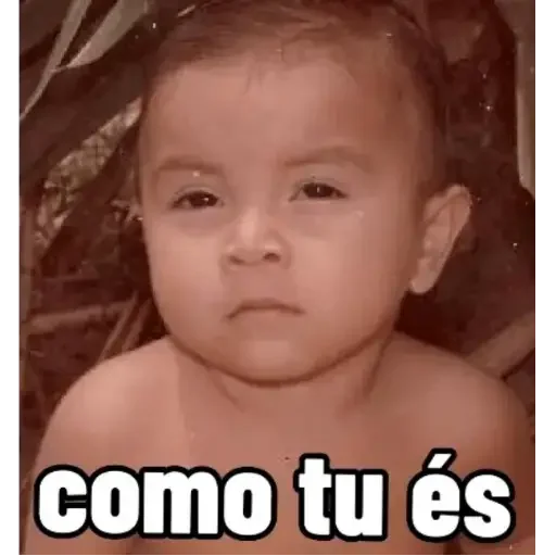 Um bebê com expressão séria e o texto 'como tu és' em branco na parte inferior.