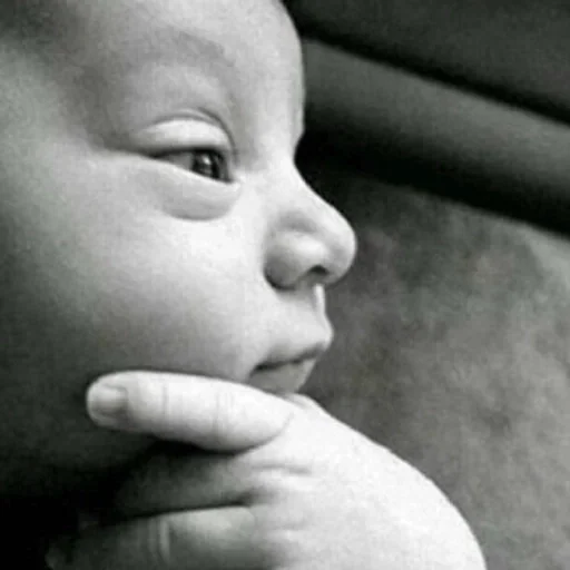 Rosto de bebê pensativo em preto e branco, com a mão no queixo.