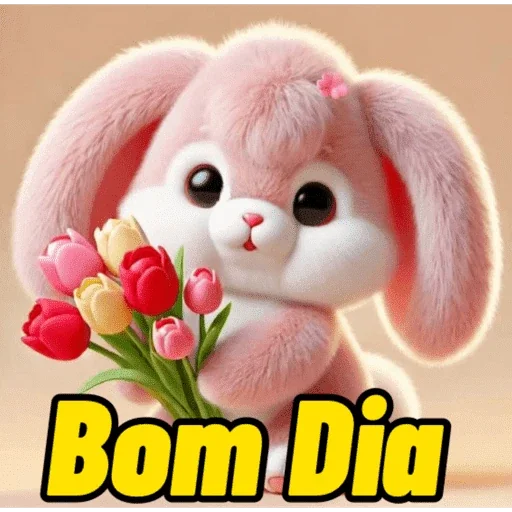 Um coelho de pelúcia rosa com orelhas grandes e olhos pretos segurando um buquê de tulipas coloridas e a frase 'Bom Dia' em letras amarelas.