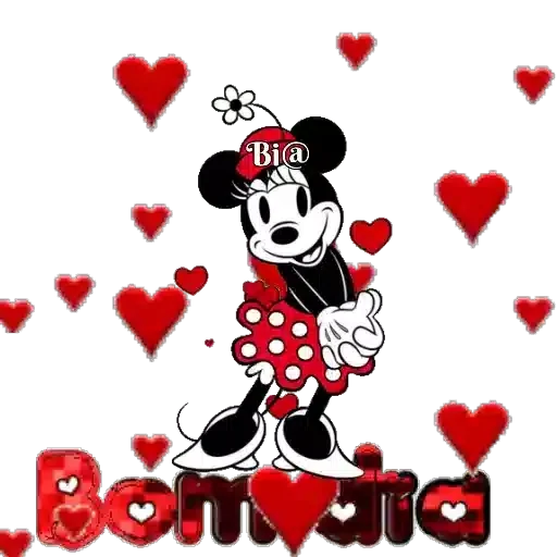 Minnnie Mouse vestida de vermelho com um laço na cabeça que diz 'Bia', com saias de bolinhas e muitos corações vermelhos ao redor, com a frase 'Bom dia' embaixo.