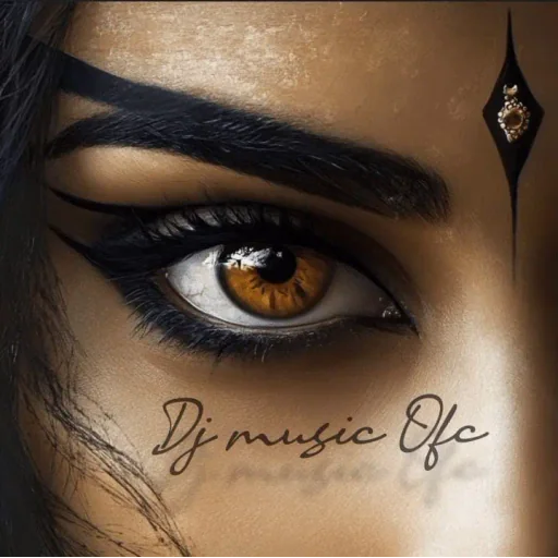 Olho de uma mulher com maquiagem, sobrancelha e cílios marcados. O olho é castanho com detalhes em preto. Há texto 'Dj music Ofc' em cursivo na parte inferior.