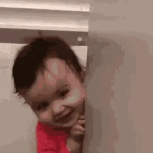 Menino com camisa vermelha espiando de trás de uma parede, com expressão curiosa e divertida.