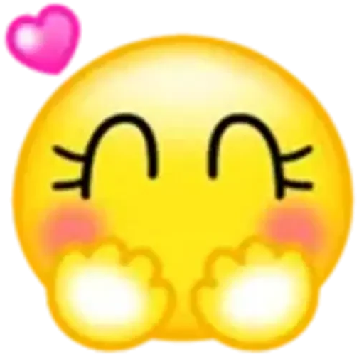 Emoji amarelo com olhos fechados e bochechas rosadas, mãos sobre a boca, com um coração rosa acima.