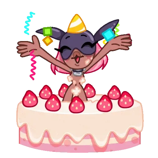 Uma personagem de anime com cabelo rosa e chapéu de festa sentada em um bolo de morango com os braços abertos.