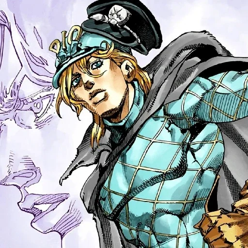 Personagem de anime com cabelo loiro, usando um chapéu preto e uma armadura azul com detalhes em dourado, com expressão séria.