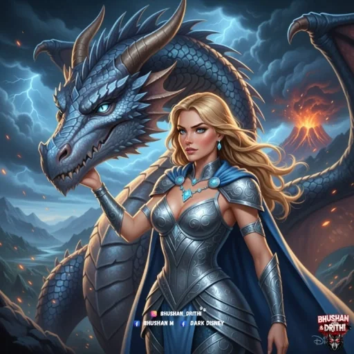 Uma mulher com armadura prateada e cabelo loiro ao lado de um dragão azul em um cenário dramático com nuvens escuras e relâmpagos.