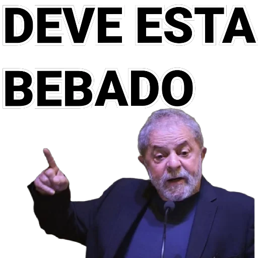 Um homem mais velho com cabelo grisalho e barba, vestindo um blazer e uma camisa azul, aponta o dedo e parece estar dizendo "DEVE ESTA BEBADO".